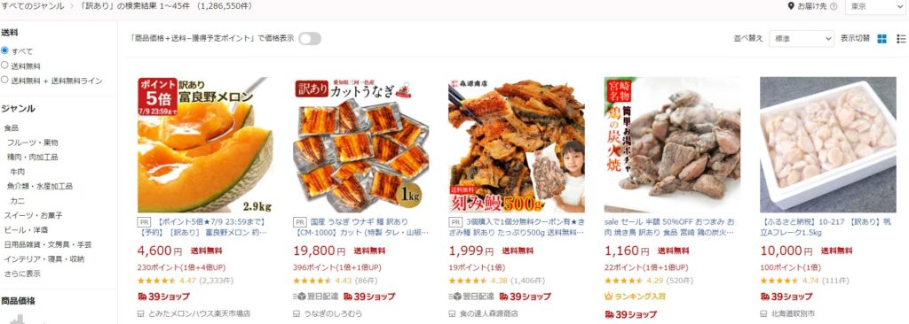 楽天で「訳アリ」と検索すると訳アリ商品が出てくる。